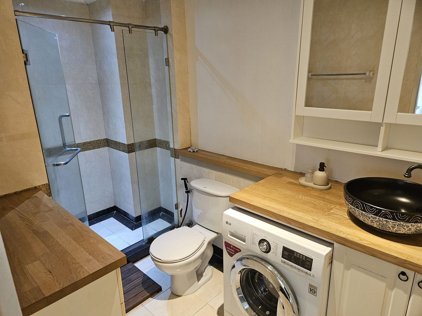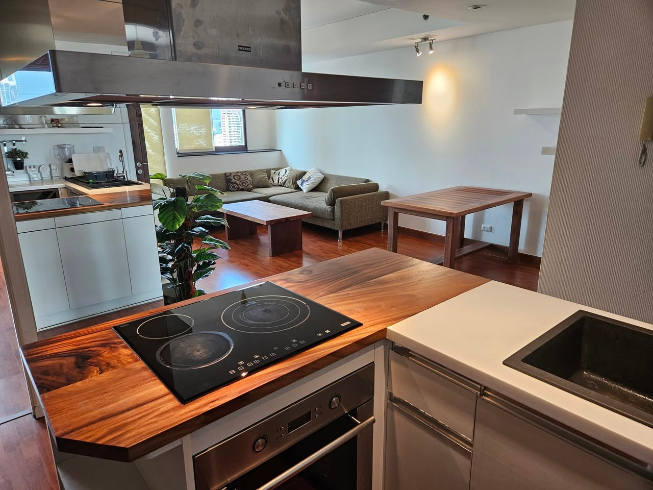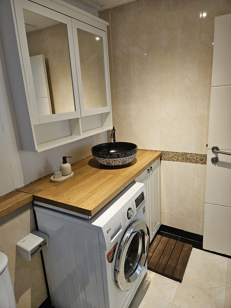 • Furnished with essentials: Traditional oven, microwave, washing machine, bed, sofa, and solid wood tables